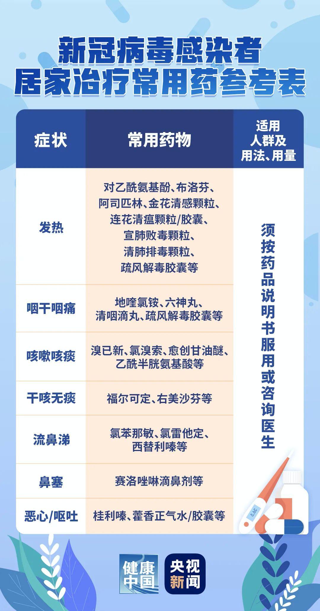 12月8日,央视网转载国家卫健委官网发布新冠感染者居家治疗指南。针对可以居家治疗的新冠病毒感染者可能出现的7种症状推荐了家庭常用参考药物。图表如下: